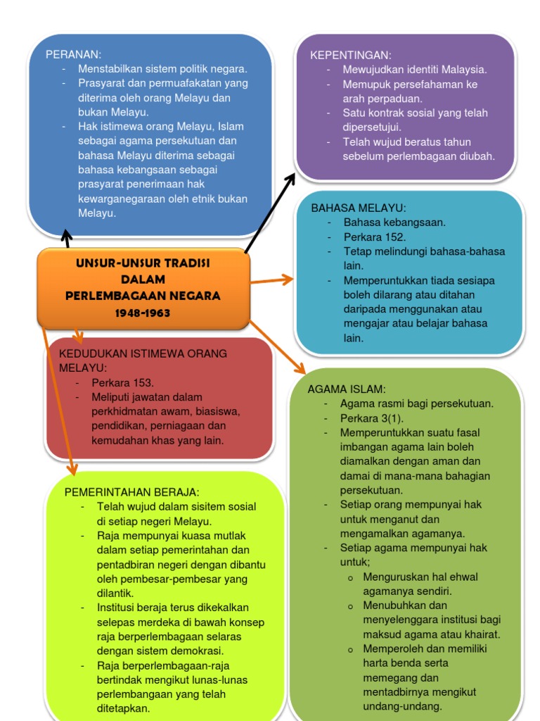 Peranan unsur tradisi • menstabilkan sistem politik negara • prasyarat dan permuafakatan yang diterima oleh orang melayu dan bukan melayu • hak istimewa orang melayu, islam sebagai agama persekutuan dan bahasa melayu diterima sebagai bahasa kebangsaaan sebagai prasyarat.