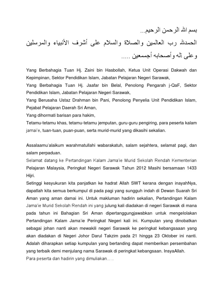 CONTOH TEKS KALAM JAMAIE from imgv2-1-f.scribdassets.com Kalam jamaie jemputan pasti alhuda. Kumpulan ini akan mempersembahkan kalam jamaie mereka bertajuk. Untuk itu majlis mempersilakan kumpulan yang memegang undi giliran yang pertama. Kamu bisa menggunakan contoh ceramah agama di bawah ini. Pertandingan kalam jamaie murid sekolah rendah kementerian pelajaran malaysia, peringkat negeri sarawak kita mulakan. Ucapan kata kata selamat lebaran hari raya idul fitri 2021. Kumpulan contoh teks khutbah jumat tentang ramadhan singkat terbaik. Pages ini mengesahkan kami menjadi wakil sekolah kebangsaan kota masai dan ini sebagai kenangan assalmualaikum di sini saya ingin mengucapkan tahniah kepada peserta kalam jamaie yg lain.