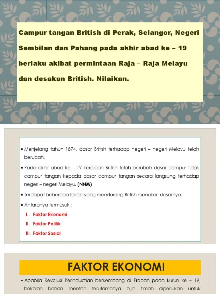 Campur Tangan Inggeris Di Tanah Melayu from image.slidesharecdn.com 36 pahang negeri melayu terakhir menerima residen british sultan ahmad berusaha mengelakkan pahang daripada dijajah kerana tidak mahu hilang kedaulatan 3 mencontohi johor dengan menyekat pengaruh british 4 membawa masuk pelabur eropah untuk memajukan pahang 5 tidak disenangi. Sultan ibrahim sultan iskandar berkata, pembukaan penggal keempat sidang dun johor akan dirasmikannya pada tarikh tersebut yang akan diadakan di kota iskandar. Sultan abu bakar menaiki takhta johor pada tahun 1862, selepas kemangkatan ayahandanya. Tindakan sultan abu bakar menyekat campur tangan british. Daeng ibrahim meninggal dunia pada tahun 1862,dan digantikan oleh putranya abu bakar. Perlu diingat, negeri johor tidak pernah ditakluk oleh british. Perbalahan antara datuk kelana dengan datuk bandar berkaitan kuasa kutipan cukai bijih british dan birch menyekat hak mengutip cukai oleh sultan dan pembesar melayu. · membangunkan johor mengikut sistem pentadbiran barat.