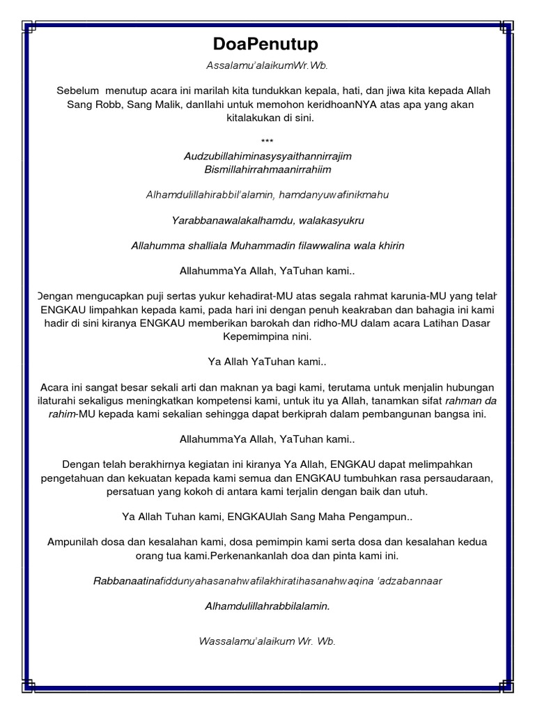 NORZI FOODILICIOUS HOUSE: DOA PAGI HARI from 3.bp.blogspot.com M alvin nur choironi4 februari 2018. Doa pembuka acara singkat dan mudah dihafal. Tidak dapat dipungkiri juga kita melakukan setiap perbuatan sulit terhindar dari dosa apapun, baik kecil maupun besar. Ketika selesai melaksanakan suatu perkumpulan yang di dalamnya berupa majelis ilmu dan kemanfaatan, maka hendaknya perkumpulan tersebut ditutup dengan doa. Doa penutup acara ada banyak, mulai dari penutup acara rapat kerja, seminar, formal, perpisahan, halal ya allah, berkahilah semua ilmu yang kami dapat selama kegiatan ini, sehingga kami dapat selain doa penutup acara di atas, kami juga memiliki doa penutup majelis yang bisa anda amalkan. Majelis banyak ragamnya, ada majelis ilmu, majelis zikir atau bahkan perkumpulan biasa. Desember 22, 2013 9 komentar. Doa penutup majelis sejatinya sudah banyak diajarkan sejak dini.